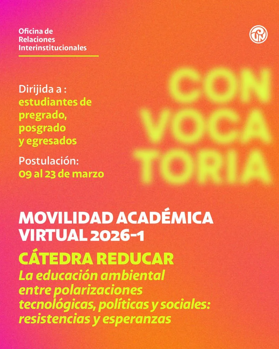 La Universidad Pedagógica Nacional invita a estudiantes de pregrado, posgrado y egresados a participar en la Cátedra REDUCAR 2026-1: La Educación Ambiental. Entre polarizaciones tecnológicas, políticas y sociales: Resistencias y Esperanzas, un espacio académico virtual que promueve el intercambio y la reflexión sobre los desafíos educativos en América Latina.