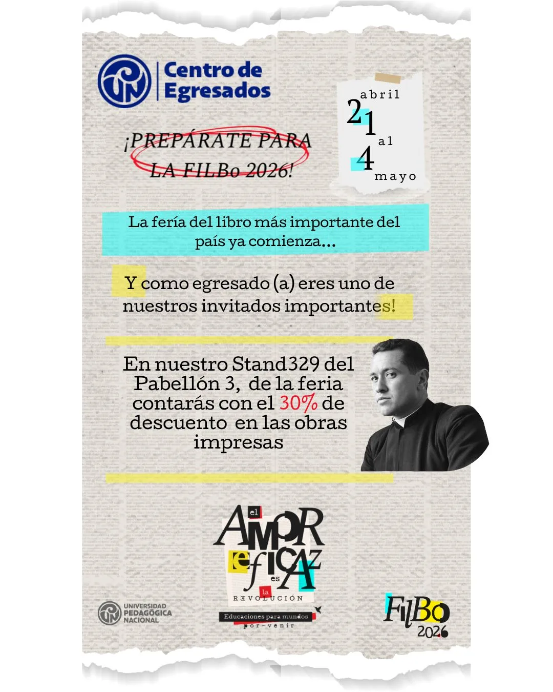 Como egresado(a) de la Universidad Pedagógica Nacional, eres un invitado especial. Por ello, te esperamos en nuestro Stand 329, Pabellón 3, donde podrás acceder a un 30% de descuento en obras impresas, además de conocer novedades editoriales y espacios pensados para el encuentro académico y profesional.